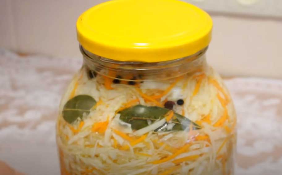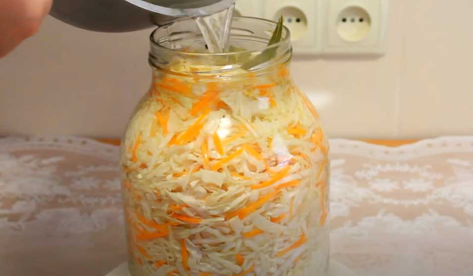 Щойно все це разом закипить, знімайте каструлю з вогню і переливайте в слоїк з овочами. Залиште банку на одну добу на кухні. Капуста має маринуватися за кімнатної температури. Після цього можна пробувати на смак. Зберігайте решту салату в холодильнику. Перед вживанням можете нарізати в капусту трішки цибулі.