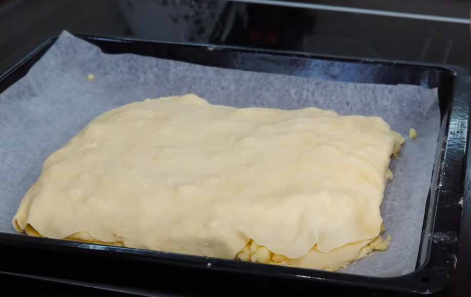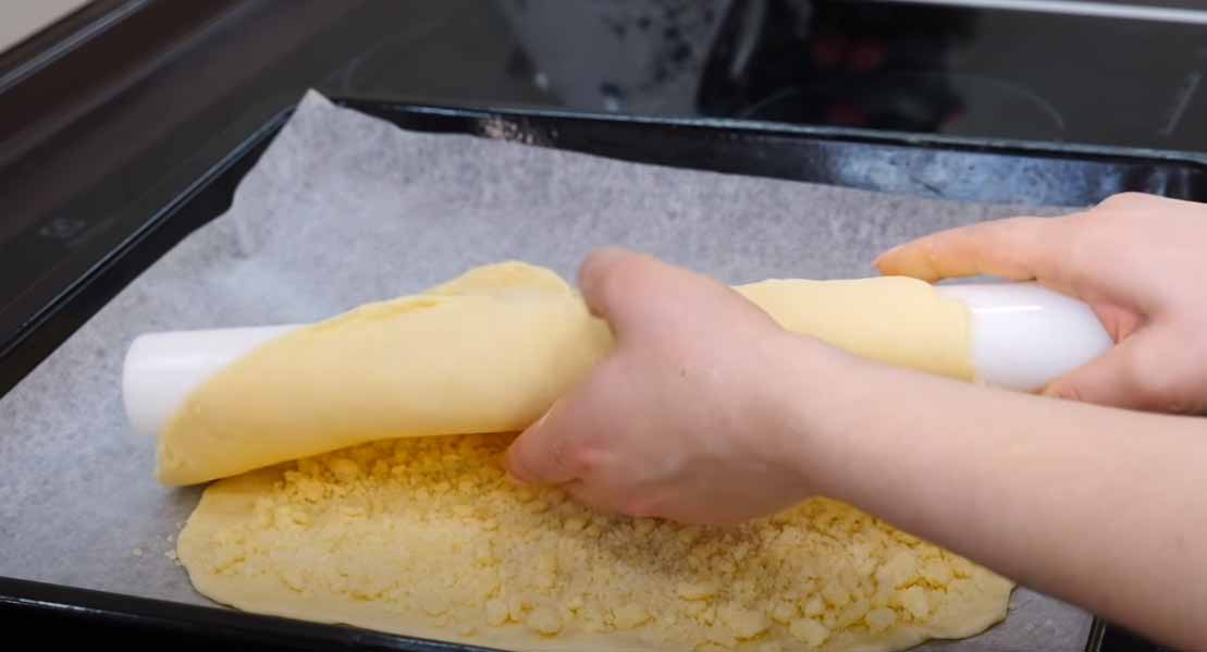 Увімкніть духовку, щоб розігрівалася до 180 градусів. Кожен шматочок розкачайте на прямокутники завтовшки 3-5 мм. Викладіть перший на деко з пергаментом. Дістаньте з холодильника крихту. Зробіть із маси 5 однакових купок. Одну з них розподіліть по коржу. Накрийте другим коржем. Легенько притисніть руками та викладіть шар крихти.