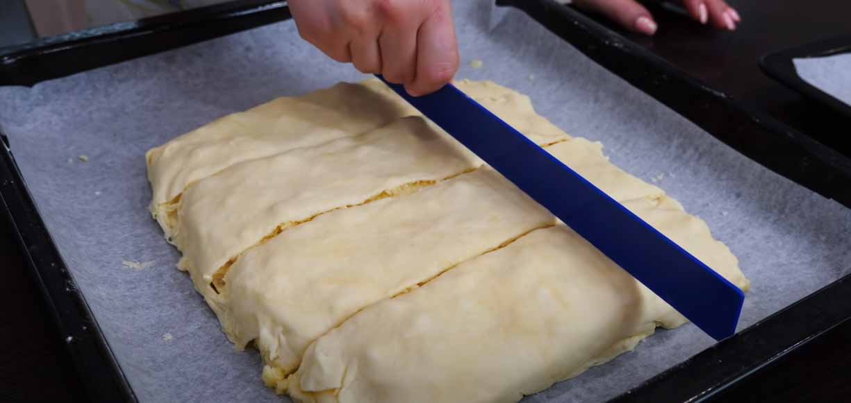 Солодку крихту поставте в холодильник. Натомість дістаньте перший ковбик. Притрусіть килимок борошном і викладіть тісто. Допоки воно холодне, трішки обімніть його. Розділіть тісто навпіл. Кожну половинку розріжте ще на три шматочки.