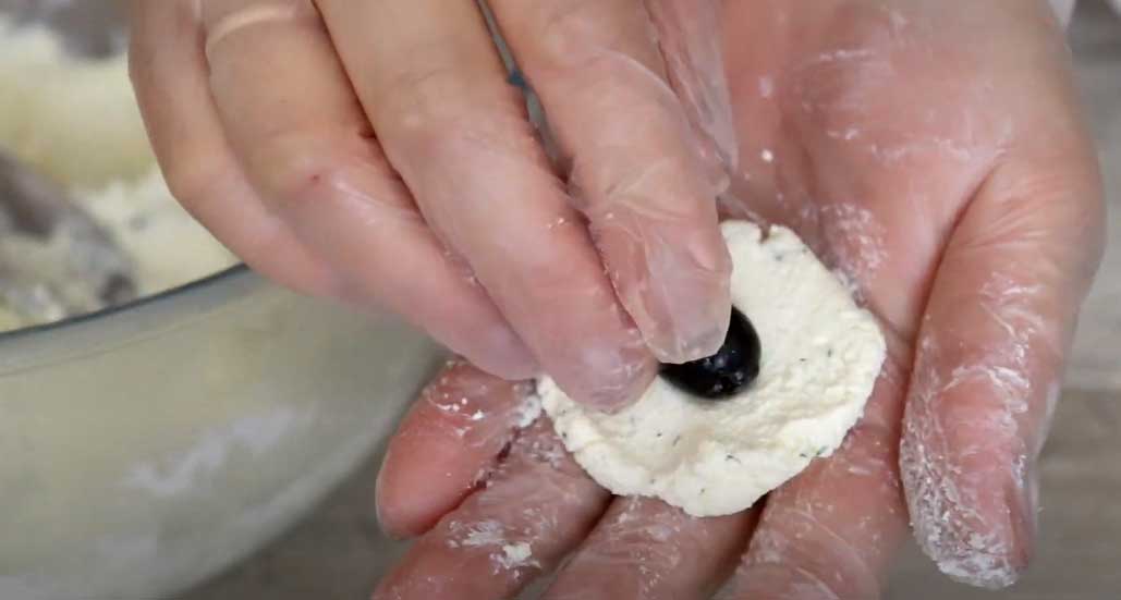 Викладіть м’який сир у мисочку, додайте плавлений сирок і розтоплене вершкове масло. Всипте подрібнену петрушку і подрібнений часник. Перебийте масу блендером. Скачайте млинець із сиру, покладіть усередину оливку та зробіть кульку.
