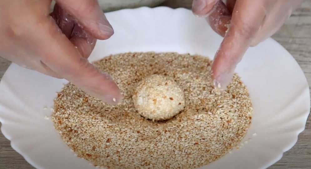 Обваляйте її в кунжутовому насінні й викладіть на тарілочку. Таким же чином зробіть решту кульок. Поставте тарілку на 2 години в холодильник, щоб кульки застигли. Після цього можете подавати їх на стіл.
