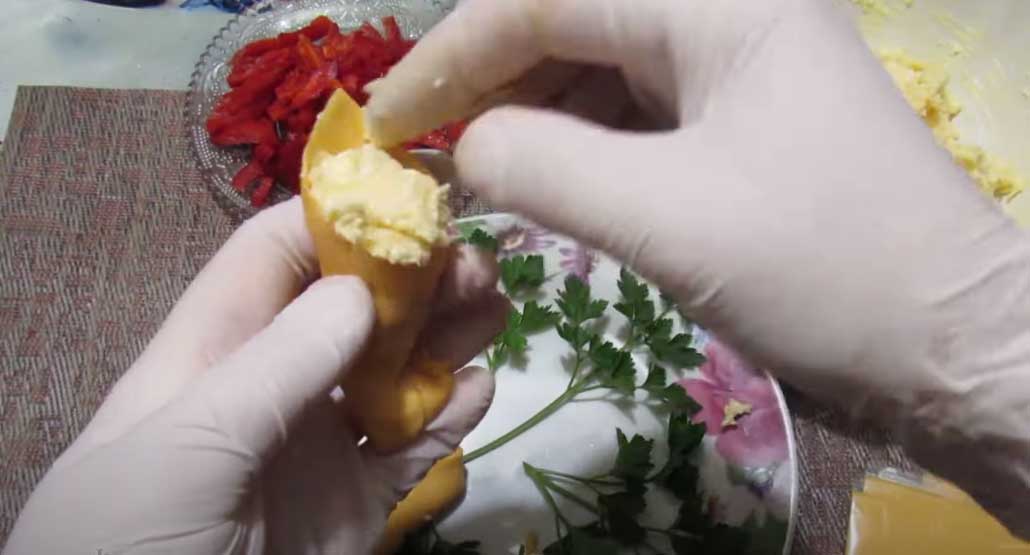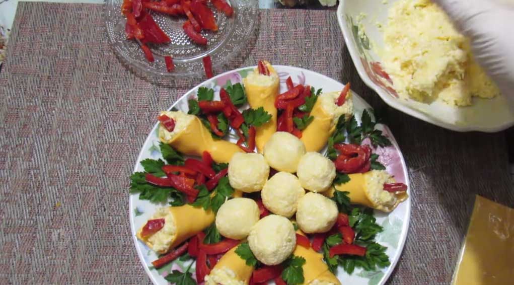 Червоний солодкий перець почистьте від насіння й наріжте смужечками. На тарілку викладіть зелень петрушки. З бутербродного сиру скручуйте трубочки, наповнюйте їх сирною сумішшю й прикрашайте шматочком болгарського перцю.