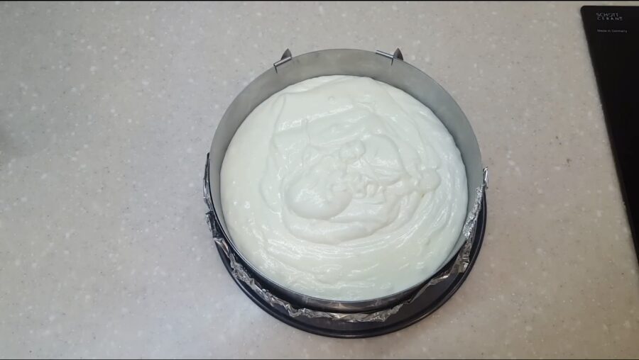 Беремо роз’ємну форму для торту. Стінки форми застеляємо ацетатною плівкою. На дно форми викладаємо корж і заливаємо половину всього суфле. Далі викладаємо другий корж і виливаємо суфле, яке залишилось.
