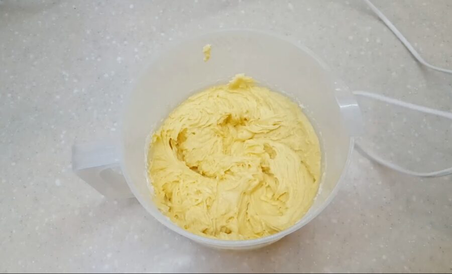 Готуємо тісто для коржів. Для цього у глибоку миску вкидаємо вершкове масло кімнатної температури і цукор. Збиваємо все міксером пару хвилин. Далі по одному додаємо в масляну суміш жовтки і продовжуємо збивати.