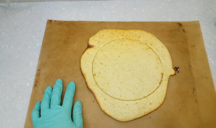 Випікаємо корж в розігрітій духовці при температурі 200 градусів 7-8 хвилин. Готові коржі підрум’яняться збоків, але будуть досить світлими всередині. Ще з гарячих коржів формою вирізаємо корж для торту.