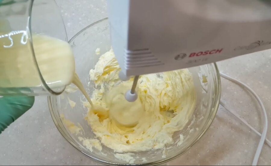 Готуємо масляний крем для суфле. Для цього у глибоку миску перекладаємо масло кімнатної температури і починаємо його збивати міксером до пишності. Далі поступово вводимо тонкою цівкою згущене молоко, продовжуючи збивати.