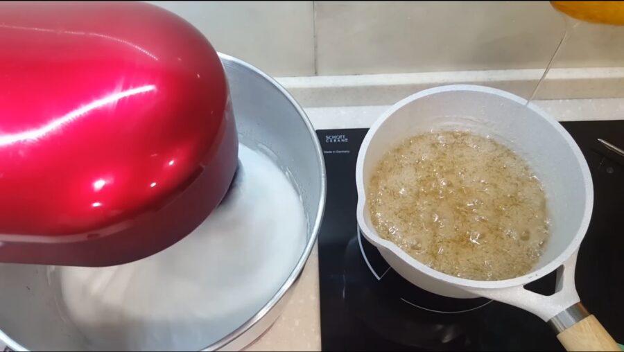 Готуємо суфле. У сотейнику змішуємо цукор, агар-агар і воду та ставимо на вогонь, щоб варився сироп. Паралельно збиваємо білки міксером до пишності. Сироп час від часу перемішуємо. Сироп після кипіння варимо ще хвилин 5-7. Температура сиропу має бути 110 градусів. Якщо у вас немає термометра, то потрібно зробити “тест” на кульку. Трішки сиропу додайте у холодну воду і спробуйте зробити кульку. Якщо кулька утворюється – сироп готовий.