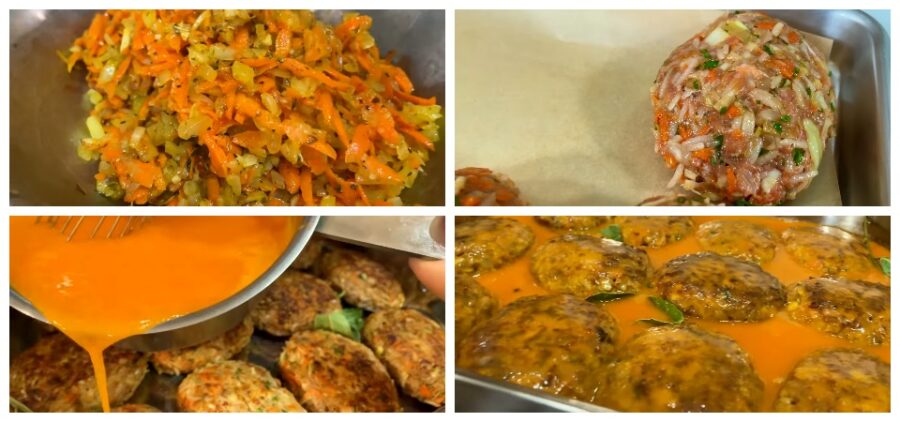 - На сковорідці з розігрітою олією обсмажте дрібно порізану цибулю та натерту на великій терці моркву. Додайте на при кінці смаження порізаний часник та суміш трав.