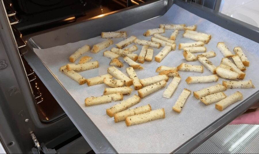 Сухарики для цього салату ви можете купити вже готові та смачніше буде, якщо зробити їх самостійно. Для цього білий хліб (батон) нарізаємо на невеличкі брусочки. Додаємо до хліба олію, прованські трави та ретельно перемішуємо. Викладаємо хліб на деко і підсушуємо у розігрітій духовці при температурі 150 градусів до рум’яності.