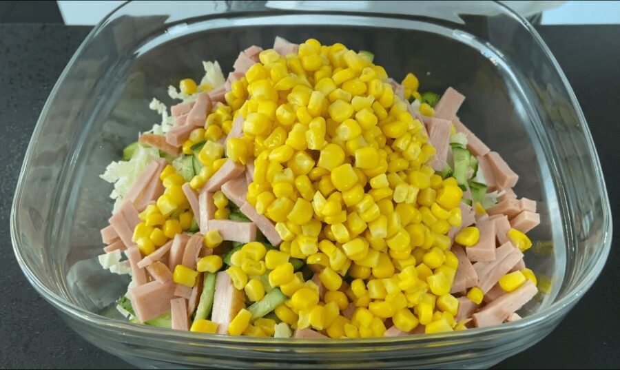 Пекінську капусту нарізаємо тонкою соломкою і перекладаємо у салатник. Огірки нарізаємо соломкою і додаємо до капусти. Шинку також нарізаємо соломкою і перекладаємо у салатник. додаємо до салату консервовану кукурудзу.
