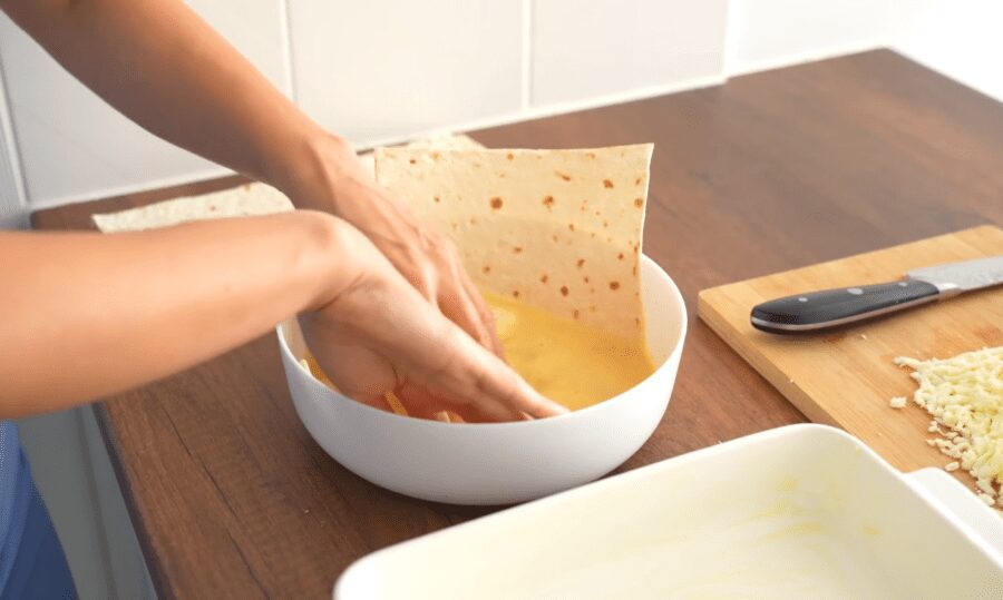 Лаваш розрізаємо на 4 прямокутника. Беремо форму для випічки і ретельно її змащуємо вершковим маслом. Кожен шматок лаваша потрібно занурити у яєчно-молочну суміш.