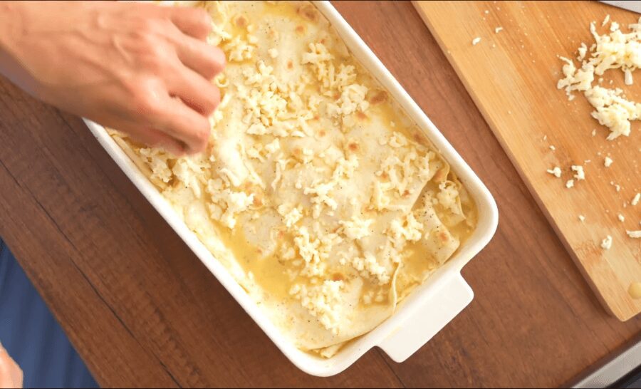 Чергуємо у форму змочені лаваші і сирну начинку. Останнім шаром має бути лаваш. Вкінці все заливаємо яєчно-молочною сумішшю, яка залишилася і злегка притрушуємо натертою моцареллою.