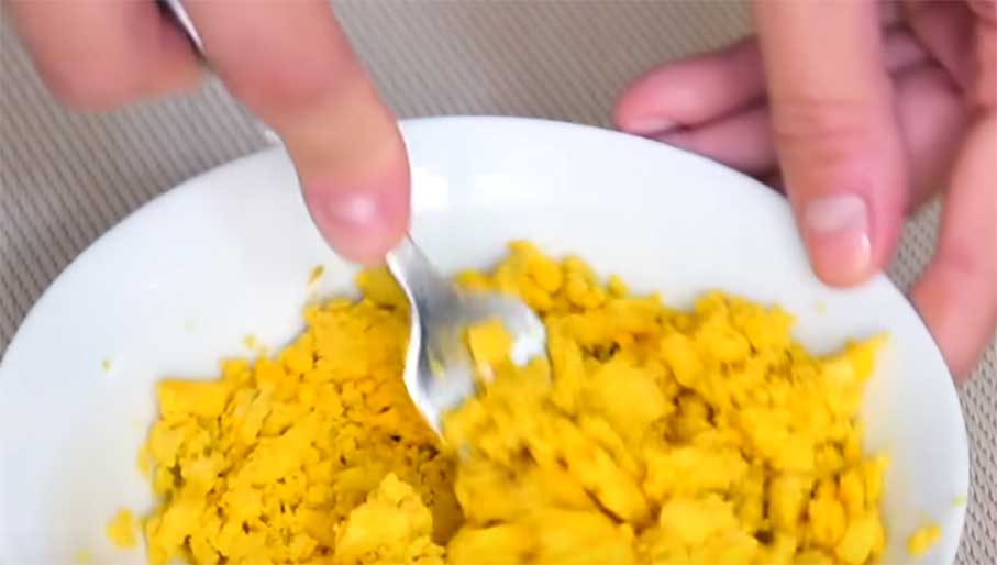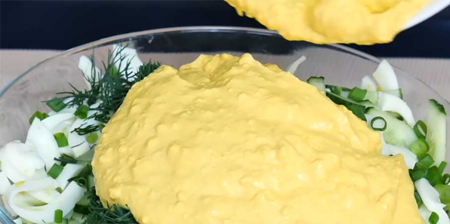 Розріжте навпіл і відділіть білок від жовтка. Половинки білків наріжте тонкими смужечками впоперек. Жовтки присоліть і роздавіть виделкою. Влийте до жовтків олію, додайте сметану й перемішайте. В останню чергу вмішайте гірчицю. Сметану чи йогурт можете наполовину змішати з майонезом для більшої пікантності.