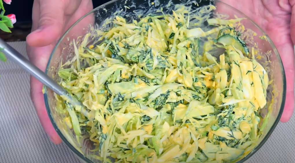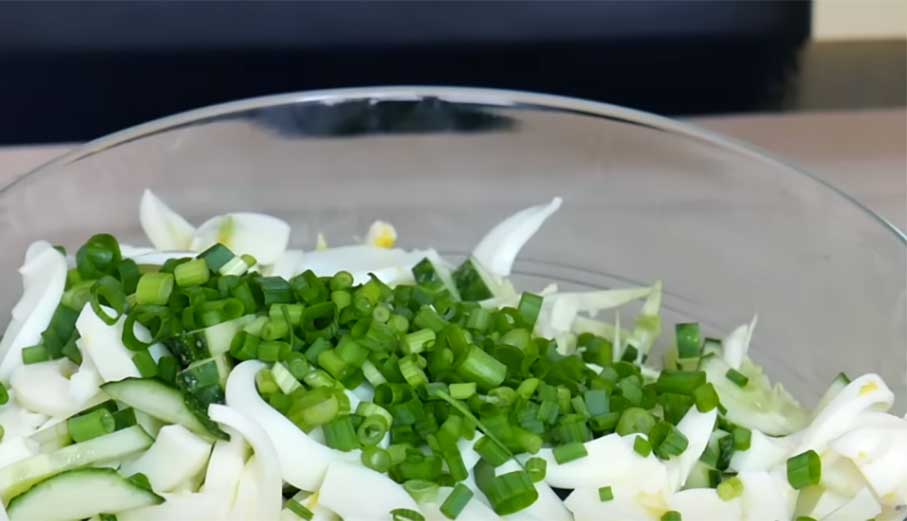 Зелень промийте під проточною водою і злегка промокніть серветкою. Подрібніть невеликий пучок зеленої цибулі. Кріп теж наріжте ножем. Відправте зелень до капусти з огірком. Додайте заправку і все перемішайте. Поставте в холодильник, щоб салат стабілізувався.