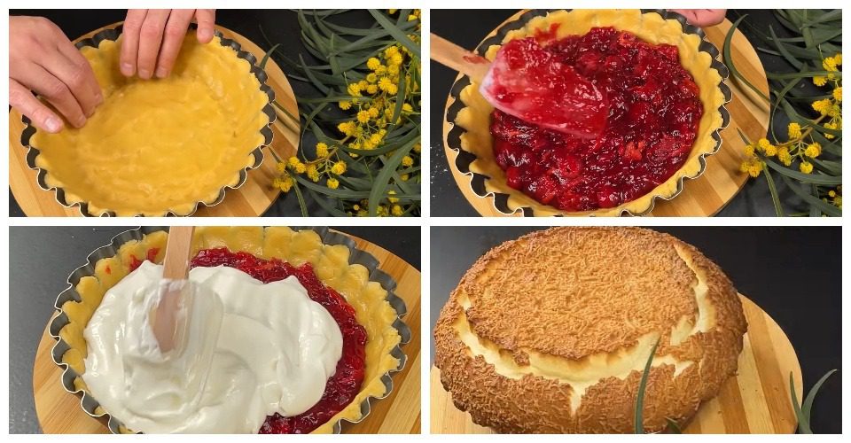 - Тісто розкладіть за формою, створюючи бортики, як показано на фото. Далі викладіть спочатку вишневу начинку. Розрівняйте її, а потім зверху викладіть білково-йогуртовий крем. Вийміть шматок тіста з холодильника та натріть його на терці поверх десерту.