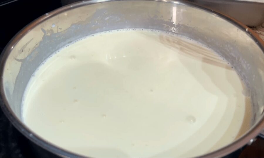 У велику та глибоку пательню вкидаємо вершкове масло і ставимо на вогонь. Коли масло розтопиться, додаємо у пателю борошно і все швидко розтираємо вінчиком. Коли борошно почне збиратися в комочки, невеликими порціями вливаємо молоко, постійно перемішуючи вінчиком. Молоко вливаємо поступово, щоб не було комочків. Вливши все молоко, додаємо ще жирні вершки. З вершками буде смачніше, але їх можна замінити молоком. Додаємо до соусу сіль та перець і доводимо до кипіння.