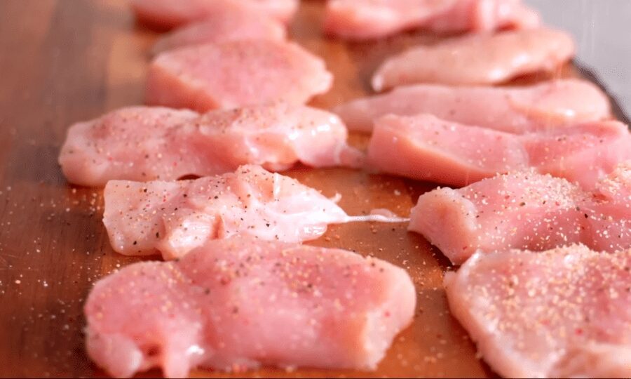 Куряче філе миємо, просушуємо і нарізаєм невеличкими шматочками і злегка відбиваємо. Додаємо до м’яса сіль, перець, паприку і сушений часник та перемішуємо.