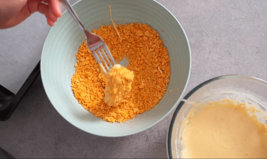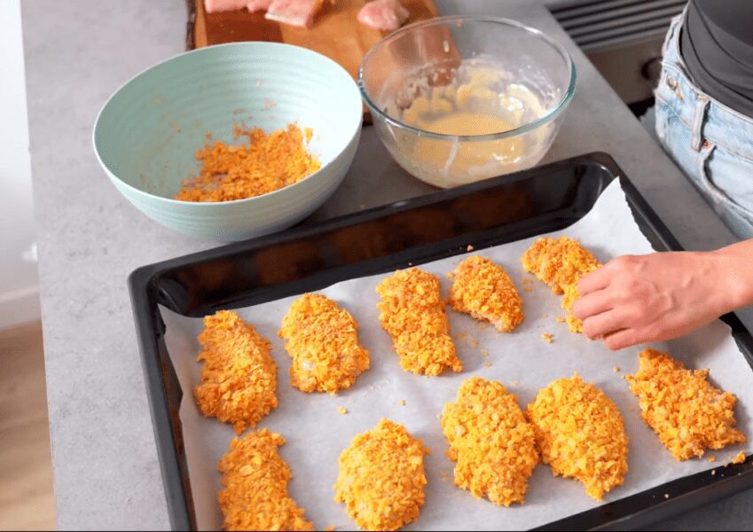 Деко застеляємо пергаментним папером і змащуємо олією. Кожен шматочок м’яса спочатку вмочаємо у кляр, а потім у паніровку із кукурудзяних пластівців. Викладаємо м’ясні шматочки на деко.