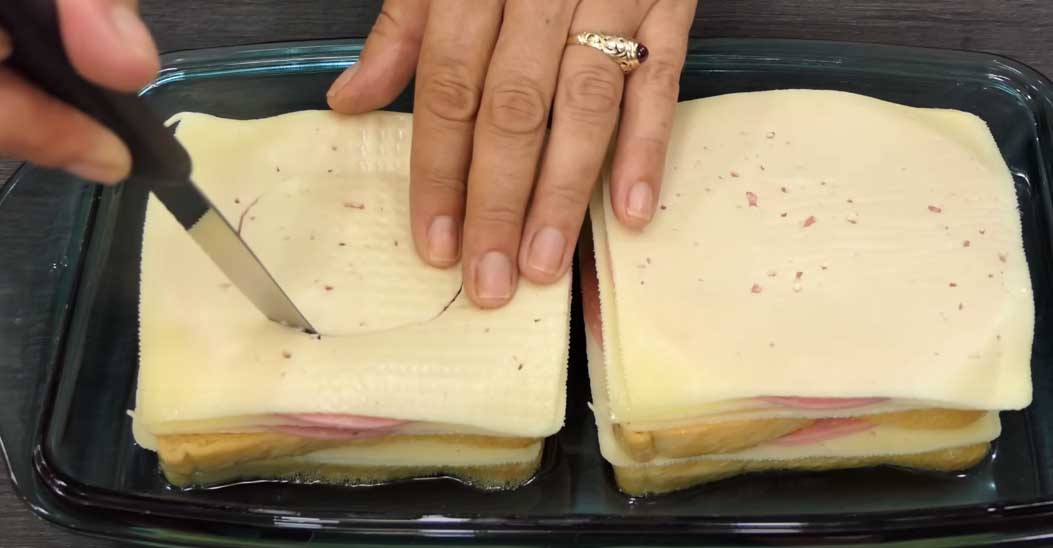 Викладіть поверх хліба шматочки сира й ковбаси, чергуючи їх між собою. Зверху накрийте шматочками хліба, які теж умочіть в яйця. Зверху покладіть ще сир і ковбасу. Їх краще купувати вже нарізаними тоненько, бо навряд чи зможете самотужки впоратися з подібною задачею.