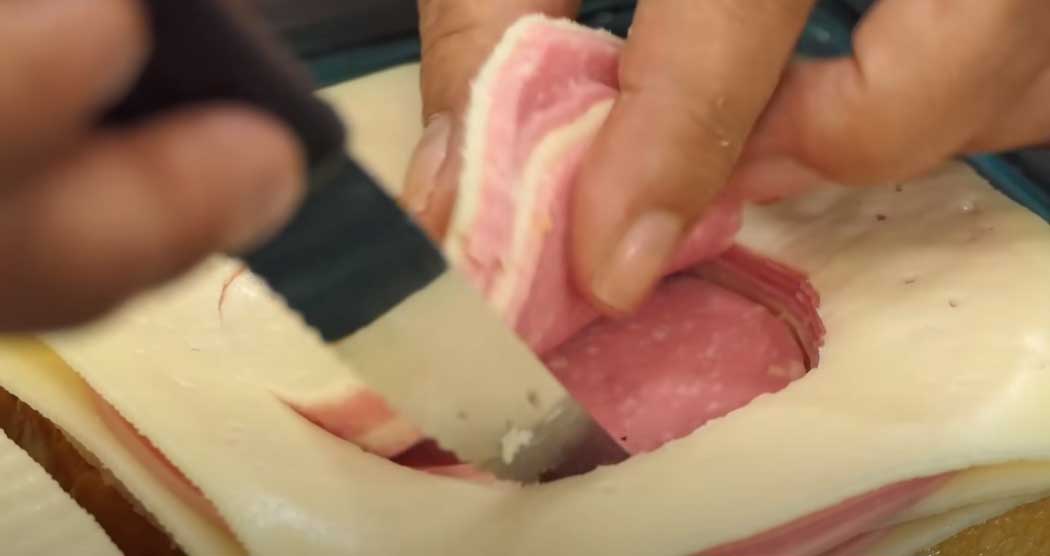 Зробіть по центру круглий надріз так, щоб він не дійшов до хлібної основи. Залиште під низом ще по шматочку сиру та ковбаси нерозрізаними.