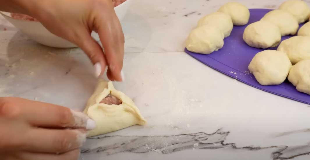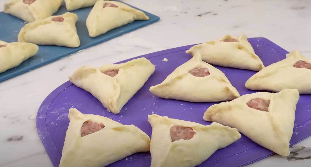 Тісто розділіть на 20 однакових шматочків. Розплескайте руками кульку з тіста, покладіть по центру начинку. Загорніть у вигляді трикутника, защипніть краї, залишивши відкритим трішки фаршу по центру.