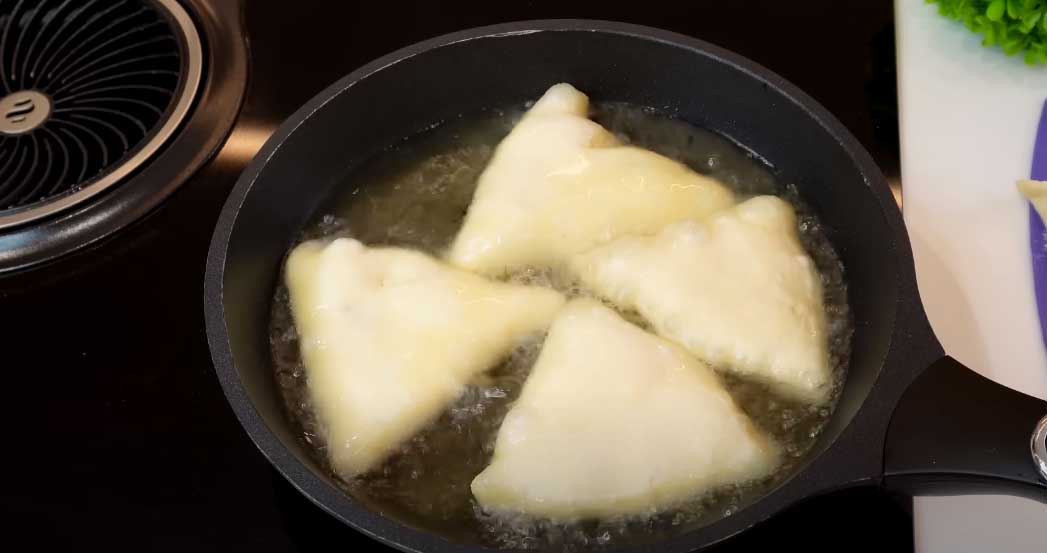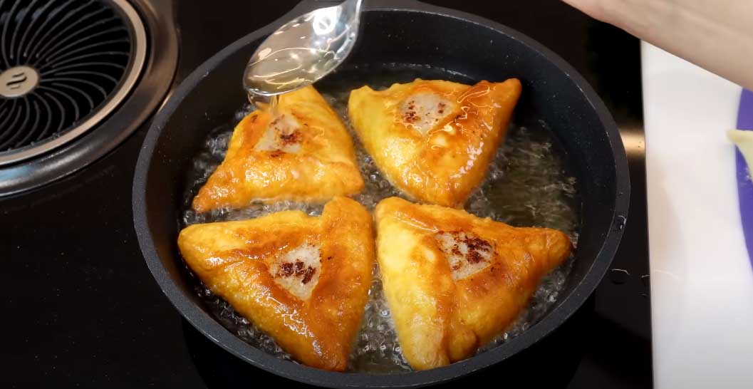 Влийте у пательню багатенько олії, розігрійте. Викладайте біляші начинкою до низу. Смажте з одного боку 5-6 хвилин на середньому вогні. Переверніть і стільки ж тримайте з іншого боку. Час від часу ложкою поливайте вироби зверху олією, зачерпуючи зі сковорідки.