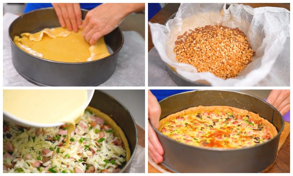У Кіш Лорені використовують бекон або шинку, а в нашому рецепті — копчене м’ясо курки. Технологія випікання пирога полягає у двоетапному процесі, про який розповімо пізніше. Але для цього потрібно від самого початку розігріти духовку до температури 200° та заготовити такий собі “вантаж” з крупи або солі.