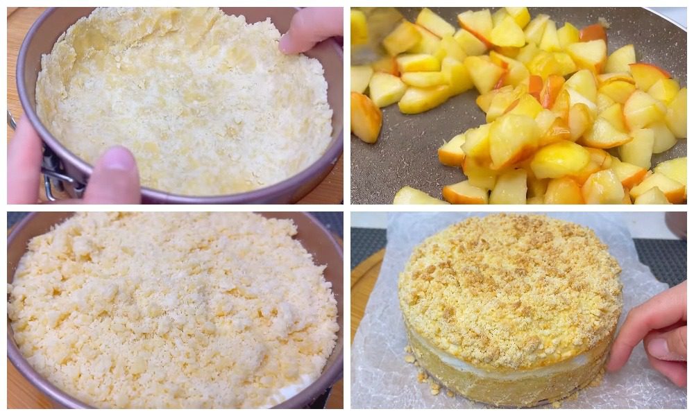 - Далі у форму покладіть розкачане тісто так, щоб воно закрило дно та борти. На тісто викладіть яблука, залийте кремом, а зверху засипте рештою тістової крихти.