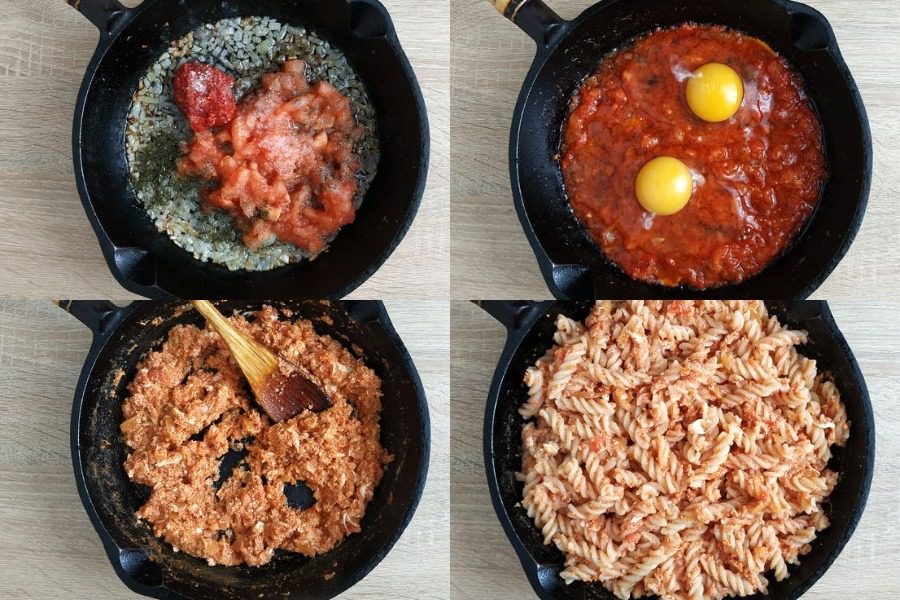 Щоб перетворити звичайні макарони в оригінальну страву з цікавим смаком, не обов’язково використовувати дорогі продукти. Достатньо заправити відварені макарони простим соусом із цибулі, м’якого свіжого помідора, томатної пасти та яєць, і вийде смачна, яскрава та ситна страва.