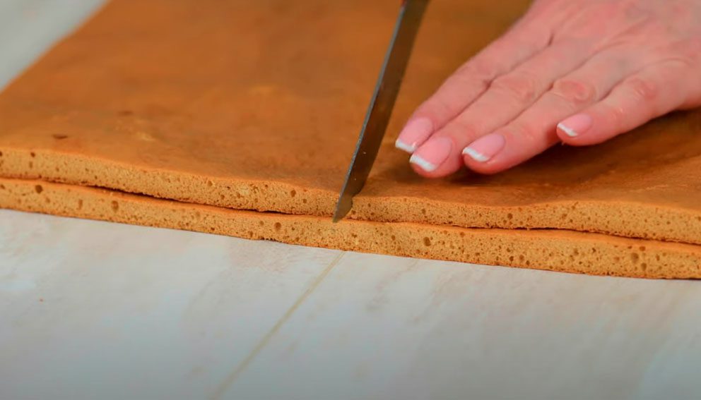 Крізь сито просійте в миску з сумішшю борошно. Ретельно перемішайте ложкою. Половину тіста перекладіть у деко, вистелене пергаментом. Випікайте в духовці близько 7 хвилин за температури 160 градусів. Витягніть готовий корж й рівно обріжте краї обрізки підуть на прикрасу медовика. Таким же чином спечіть й обріжте другий бісквіт. Складіть два коржі один на одного й розріжте навпіл.