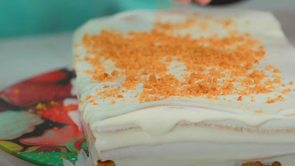 Сметану ретельно розмішайте з цукровою пудрою. Викладайте коржі по одному на пласку тарілку, змащуючи сметанним кремом. Верх та боки медовика теж змастіть сметаною та присипте обрізками коржів, перетертих на крихту блендером.
