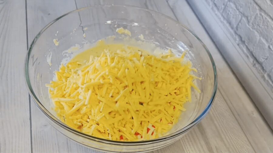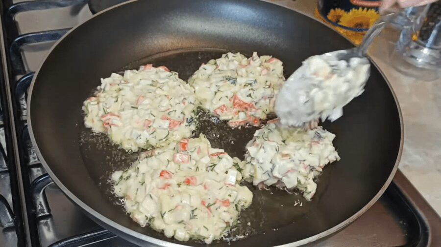Крабові палички ріжемо взовж і нарізаємо некрупними кубиками і перекладаємо до тіста. Твердий сир натираємо на крупну тертку і додаємо до інших інгредієнтів. Зелень кропу дрібно кришимо і додаємо до тіста. Все ретельно перемішуємо лопаткою до утворення однорідної суміші.