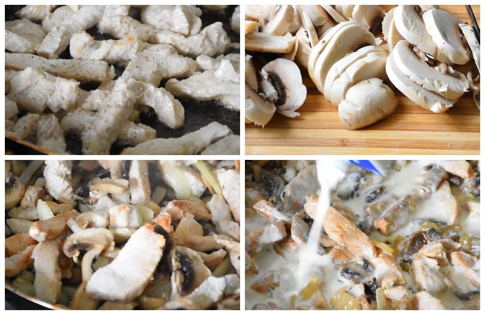 - Кожен шампіньйон наріжте слайсами товщиною до 5 мм. Їх також покладіть у сковорідку.
