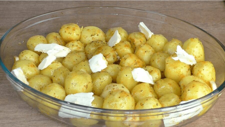 Перекладіть картоплю у форму для випікання, зверху викладіть вершкове масло, нарізане шматочками. Розігрійте духовку до 190 градусів і лише потім поставте картоплю запікатись на 25-30 хвилин. Перевіряйте готовність у процесі.
