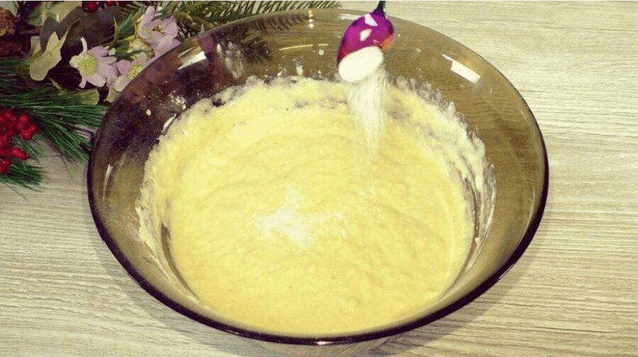 Висипте у рідку частину половину просіяного борошна та ретельно перемішайте. Додайте соду та залишок борошна. Вимішуйте тісто, поки не зникнуть грудочки, які можуть утворитись.