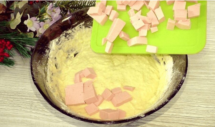 Далі додаємо основний інгредієнт цієї смачної закуски – варену ковбасу. Її потрібно нарізати на кубики, аби оладки не лише добре смакували, але й красиво виглядали.