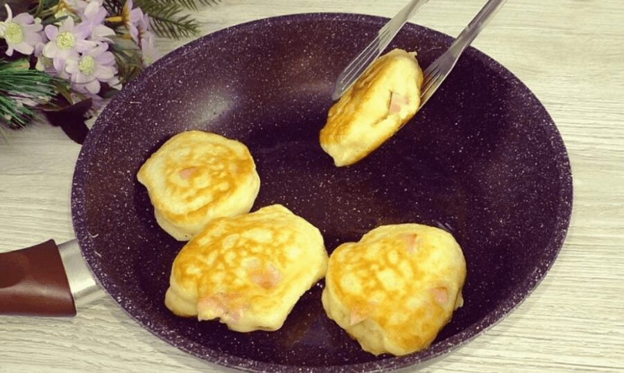 Наступним кроком потрібно розігріти сковорідку та налити на неї трішки рослинної олії для смаження. Ложкою викладіть на розігріту пательню порції тіста з ковбасою та смажте з обох боків до утворення золотої скоринки.