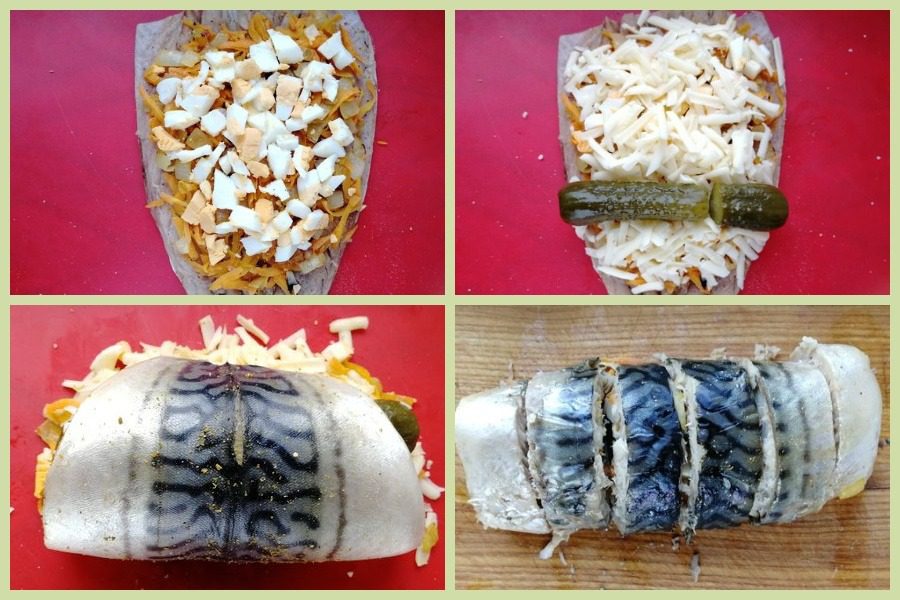 Рулет із скумбрії, фаршированої маринованими огірками, яйцями та сиром, готовий до подачі. Смачного!