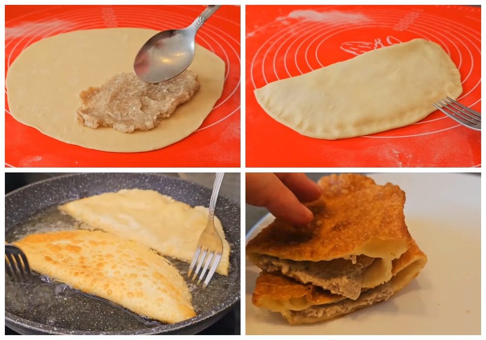 Звичайно, існує багато інтерпретацій приготування таких пиріжків з прісного тіста. Об’єднує всіх форма, м’ясна начинка та смаження у великій кількості рослинної олії.