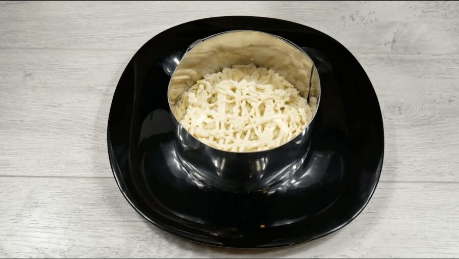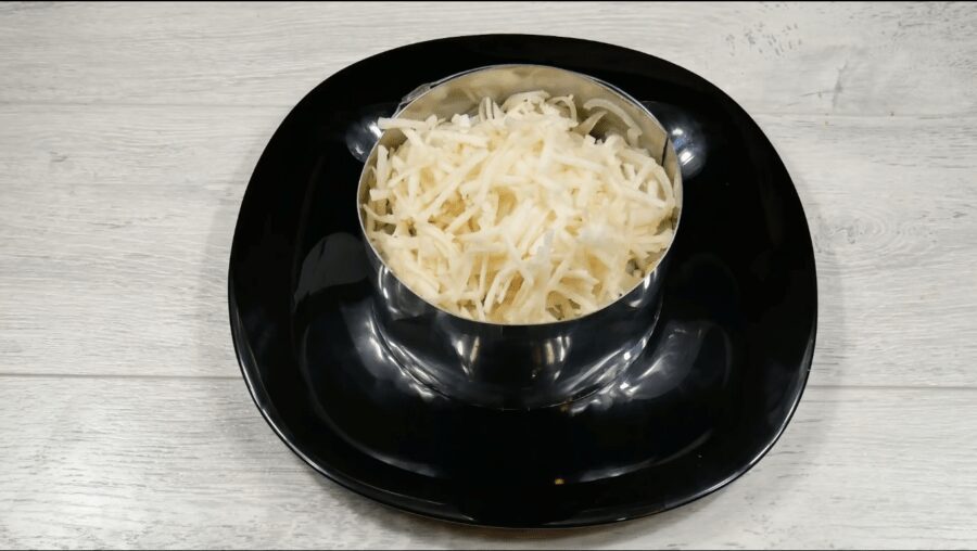 Беремо плоску тарілку для салату. Для того, щоб салат мав ідеально круглу форму можна використати кондитерське кільце. Першим шаром викладаємо натерту на крупній тертці картоплю. Цей шар злегка присолюємо, перчимо і щедро змащуємо майонезом.