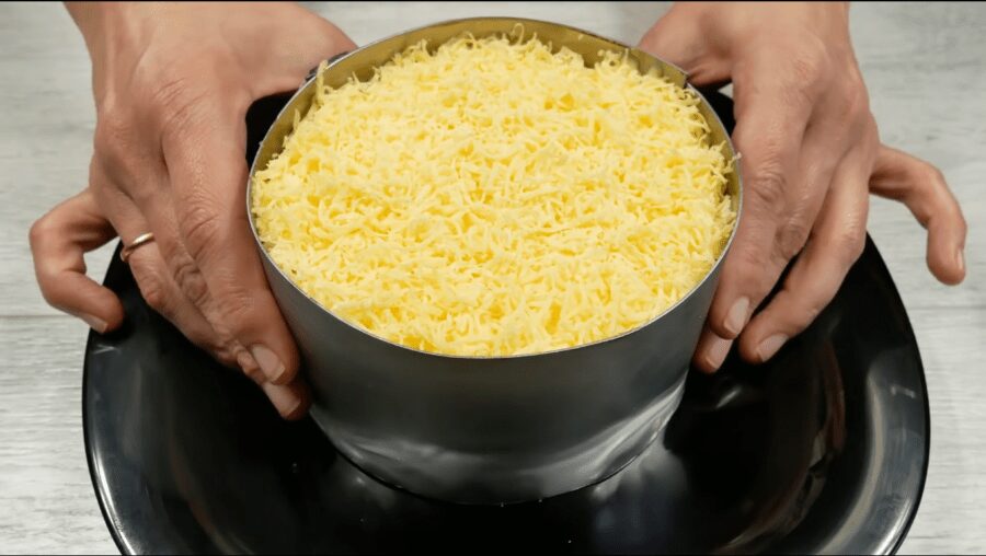 Наступним шаром викладаємо натертий на дрібній тертці твердий сир і змащуємо майонезом. Останнім шаром викладаємо яєчні білки, натерті на крупну тертку. Зверху щедро все змащуємо майонезом і присипаємо дрібно натертим сиром.