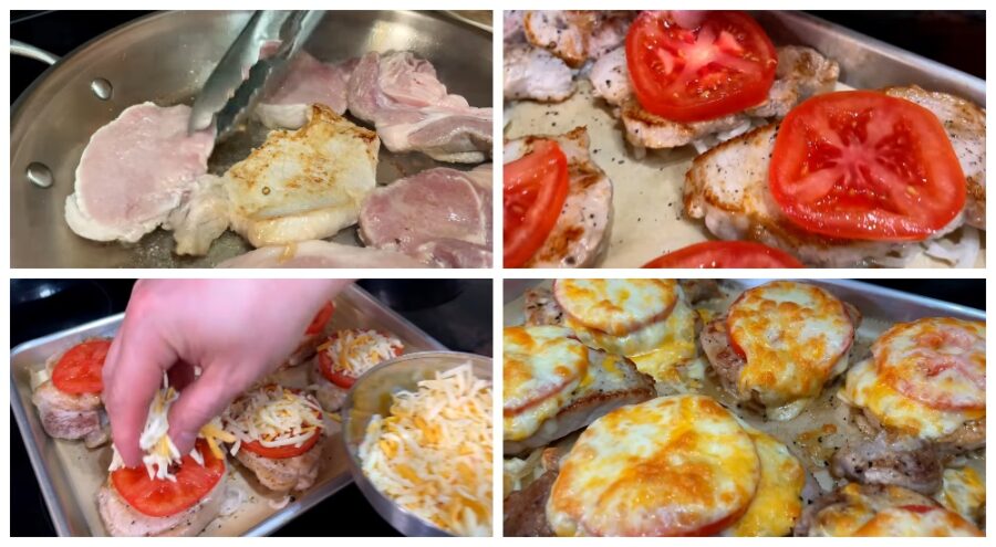 - Тепер цибулю на деко розкладіть на 6 порцій. Зверху викладіть обсмажене м’ясо. На нього покладіть по 1 кружечку помідора. На помідор насипте приблизно по 1 столовій ложці сиру.