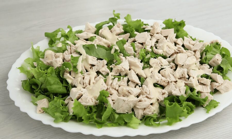 На листя салату викладаємо нарізане середнім кубиком куряче філе. Зверху поливаємо м’ясо невеликою кількістю соусу.