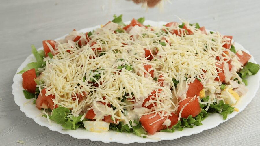 Поливаємо салат соусом і засипаємо зверху натертим на дрібну тертку твердим сиром.
