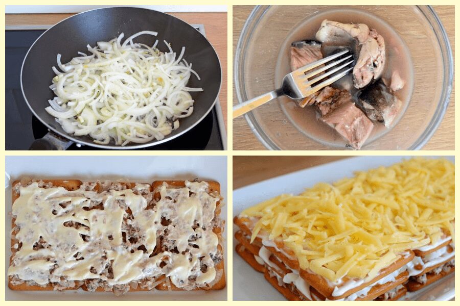 Смачна та швидка закуска у вигляді торта із крекерів. У закуску можна обрати будь-які рибні консерви, які вам до вподоби. Для начинки ми беремо смажену цибулю, варені яйця та твердий сир.