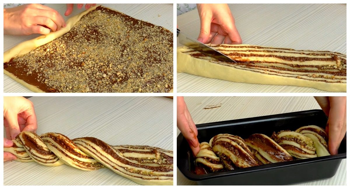 - Тепер гострим ножем розріжте рулет вздовж навпіл та переплетіть частки між собою, як на фото. Покладіть пиріг у форму та випікайте у духовці 35-40 хвилин. Так само поступіть й з другою частиною тіста.