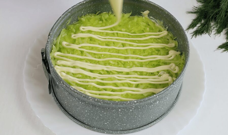 Огірки чистимо від шкірки і натираємо на крупній тертці. Сік, що утворився виливаємо, а самі огірки викладаємо наступний шаром і злегка присолюємо. Робимо сіточку з майонезу.