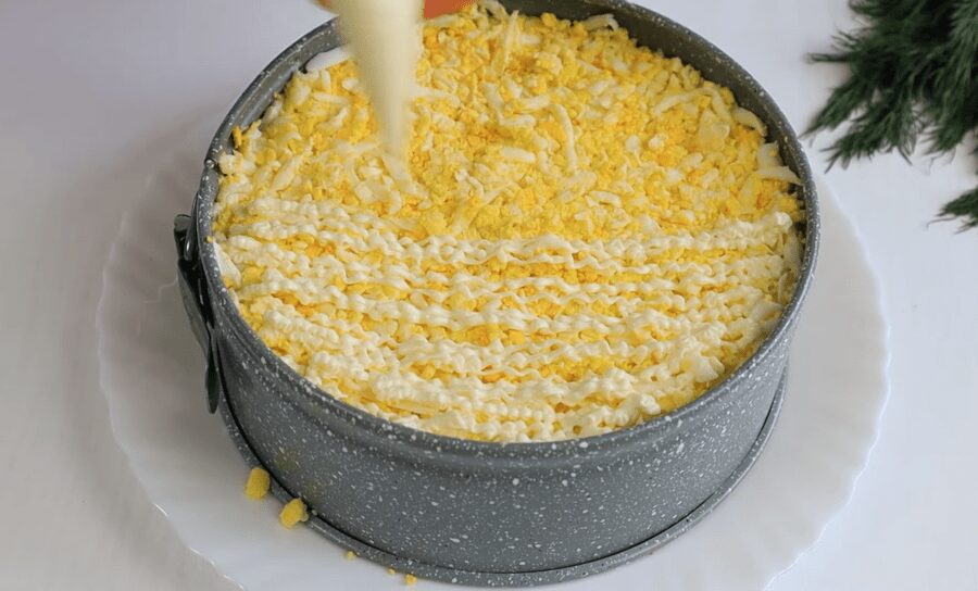 Наступним шаром викладаємо консервовану кукурудзу і також її змащуємо майонезом. Наступним шаром натираємо на крупній тертці відварені яйця. Цей шар злегка присолюємо і змащуємо майонезом.