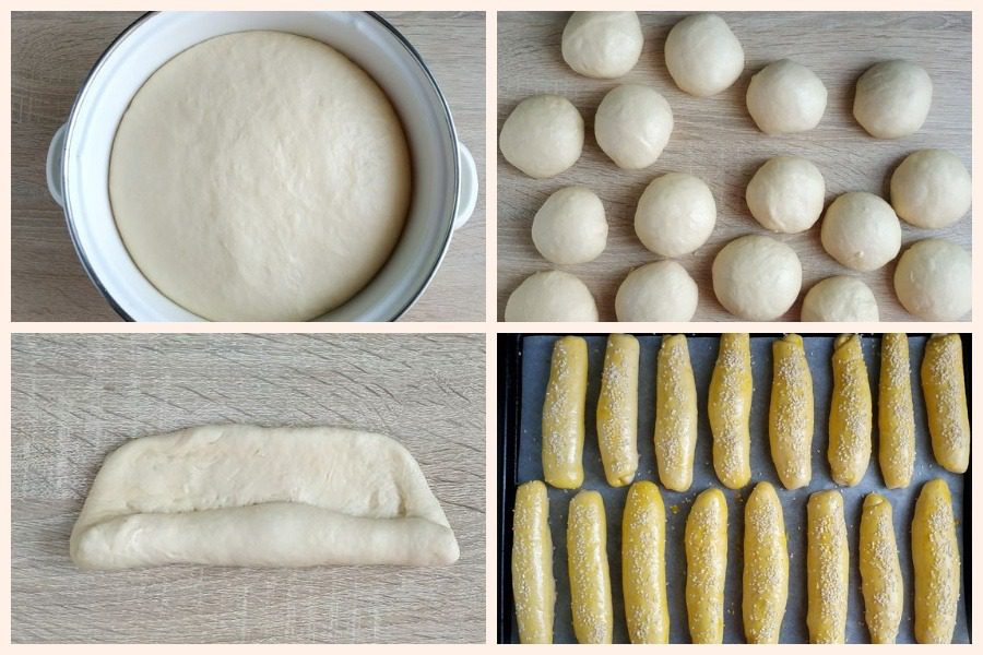 - Розділіть тісто приблизно на 15 рівних шматочків і сформуйте з нього кульки. Згорніть тісто в довгий нещільний рулет, формуючи довгі булочки.