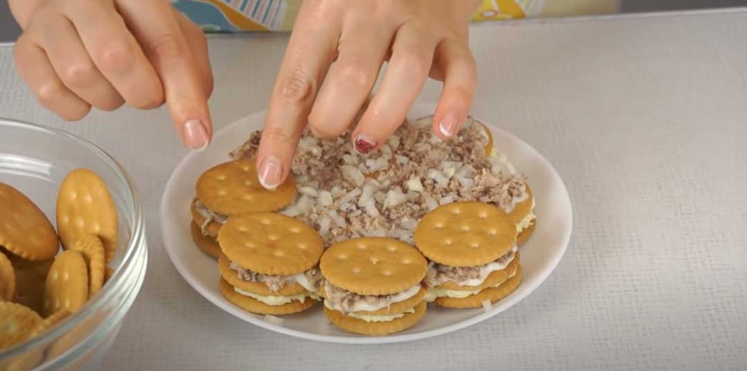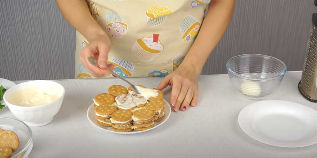 На тарілку викладіть шар крекерів по колу. Якщо в середині залишиться вільне місце, заповніть його розламаними половинками чи четвертинками печива. Змастіть третиною суміші яєць із майонезом. Розподіліть виделкою по всій поверхні крекерів рівномірно.
